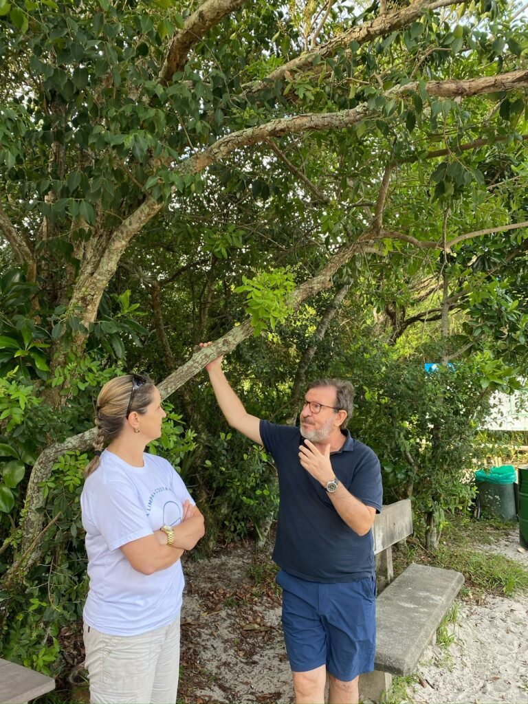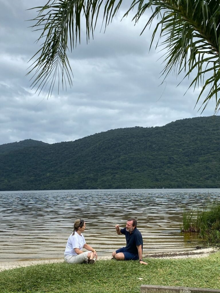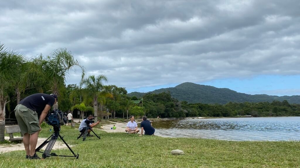 Nas margens da Lagoa do Peri, em Florianópolis, o repórter Ricardo Von Dorff entrevista a coordenadora do Bandeira Azul Brasil, Leana Bernardi, que fala sobre os critérios do programa. Crédito de foto: Bandeira Azul.