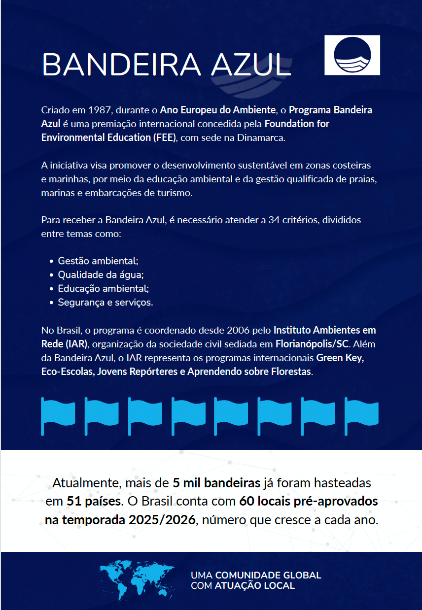 Neste ano, o estado de São Paulo recebe a Cerimônia de Entrega da Bandeira Azul, um importante selo de reconhecimento internacional conferido a praias, marinas e embarcações de turismo comprometidos com a qualidade ambiental e compromisso com o  turismo sustentável. O prestigiado evento está programado para ocorrer no dia 31 de outubro de 2025, às 14h, nas instalações do Iate Clube Santos – Sede Guarujá.
