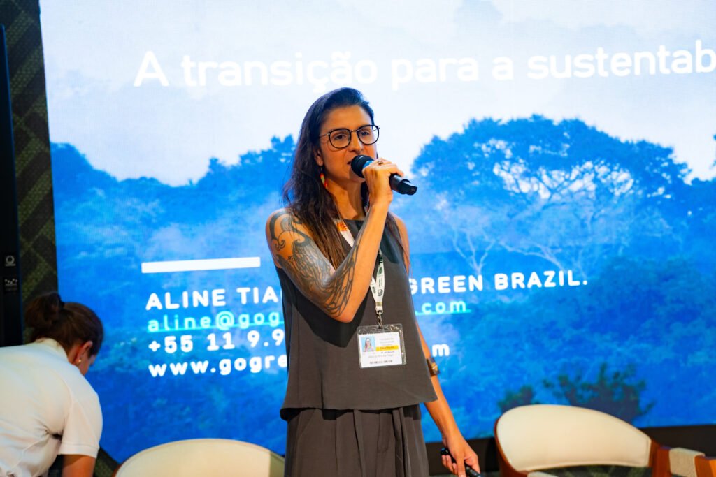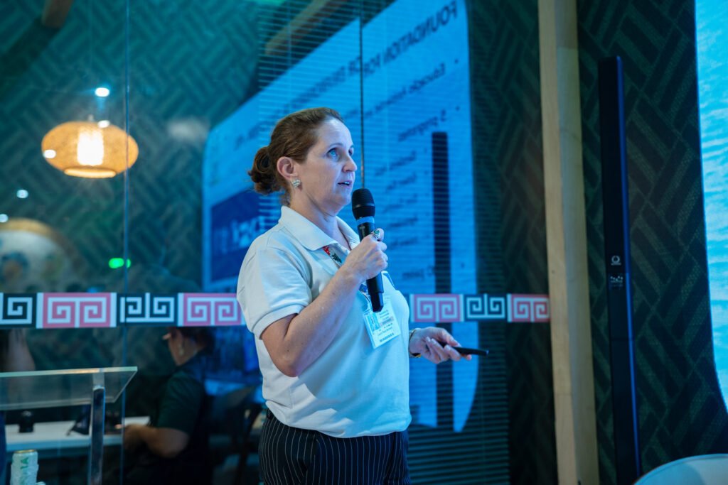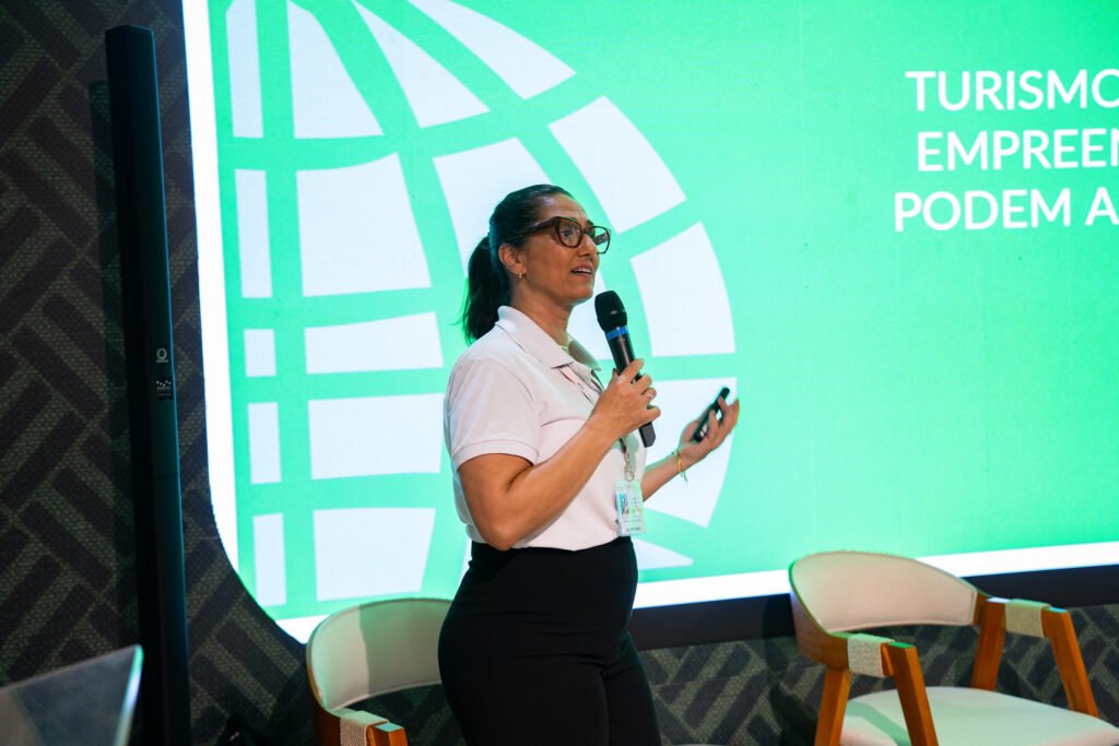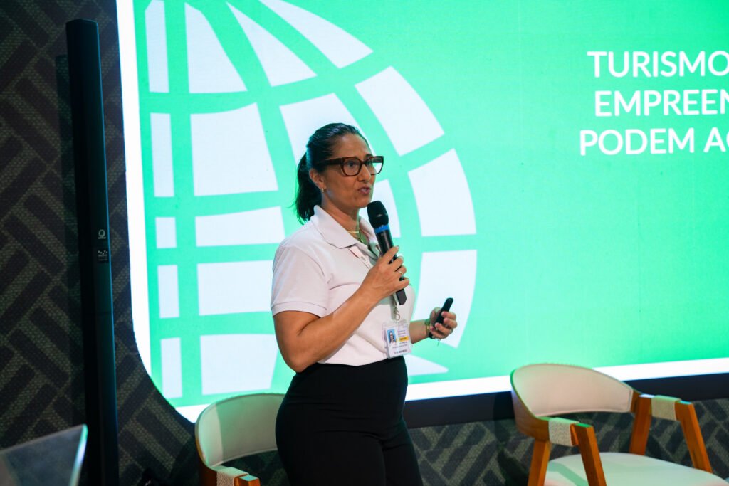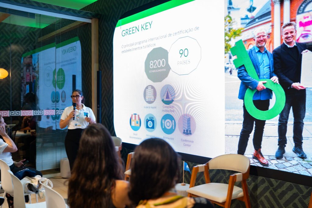 Leana Bernardi apresentou como a gestão qualificada de praias e marinas certificadas contribui para a melhoria da qualidade da água e o fortalecimento da governança ambiental. Fernanda Melo, coordenadora nacional do Programa Green Key Brasil, trouxe exemplos de ações que empreendimentos turísticos podem adotar para reduzir emissões e operar com critérios internacionais de sustentabilidade. A mesa foi moderada por Aline Tiagor, que diferenciou ecoturismo e Turismo de Base Comunitária (TBC) e reforçou a importância de práticas sociais responsáveis e da construção de um handprint positivo — contribuições duradouras que vão além da mitigação de impactos.
